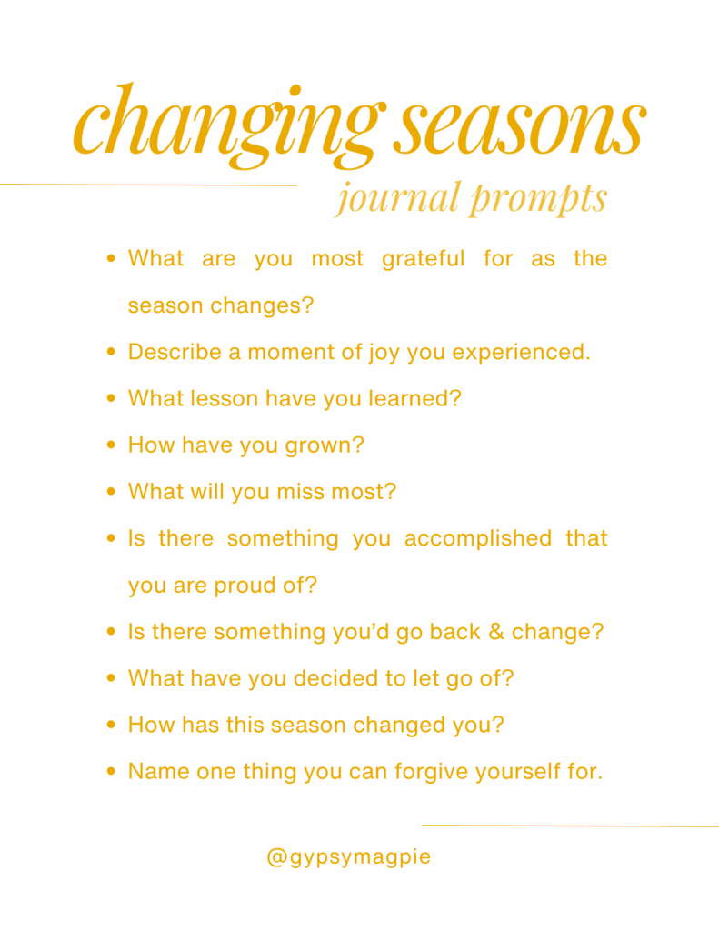 If, like me, you’re feeling the energy of the seasonal shift, may I gently suggest dusting off your journal and laying it out on the page? Release what’s no longer serving you and invite in goodness and light to fill it’s place. Learn from where you’ve been, create dreams for the future, and then allow yourself to step, fully present, in the moment and season you now find yourself in. With love, I offer these prompts to guide the way. As always, take what you need and leave the rest.